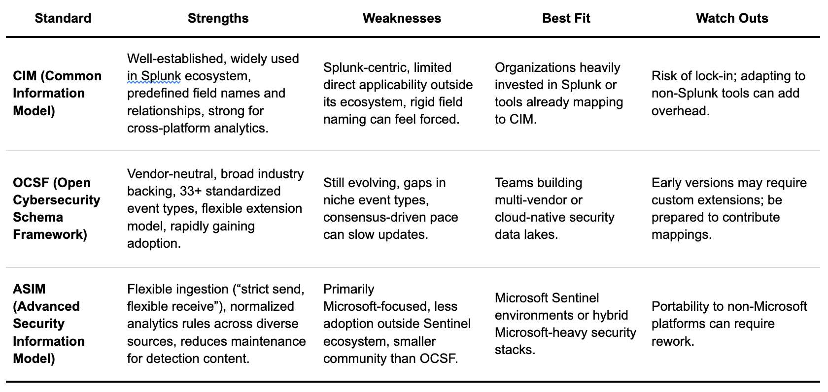 First, some standards. Best practices in security data modeling have crystallized around several key frameworks and methodologies that address the unique challenges of security data. I’ve listed the three big ones below along with their strengths, weaknesses, etc.